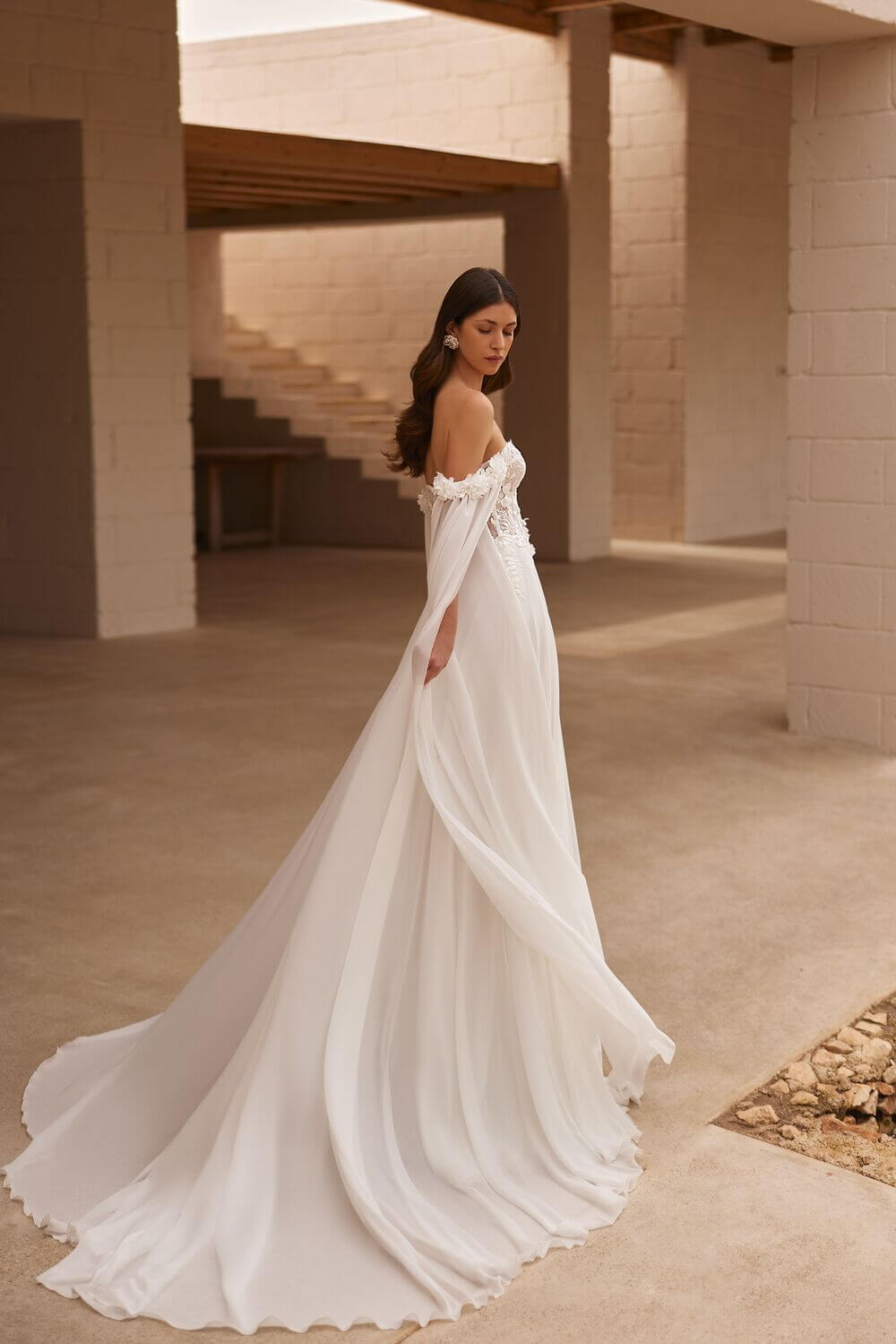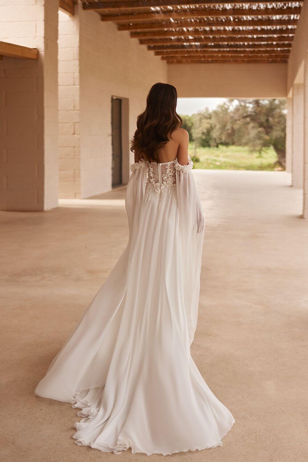 Niezwykle romantyczna suknia ślubna wykonana ze zwiewnego materiału, żorżety. Gorsetowa góra uwydatniająca dekolt zdobiona jest koronowymi aplikacjami z roślinnym motywem 3D. Uroku dodają długie, powabne rękawki obszyte kwiatkami oraz półprzeźroczyste wycięcie pod biustem. Rozcięcie eksponuje nogę a długi tren dodaje eteryczności.