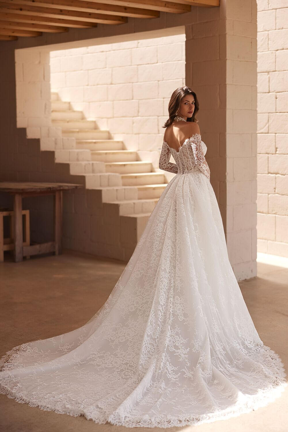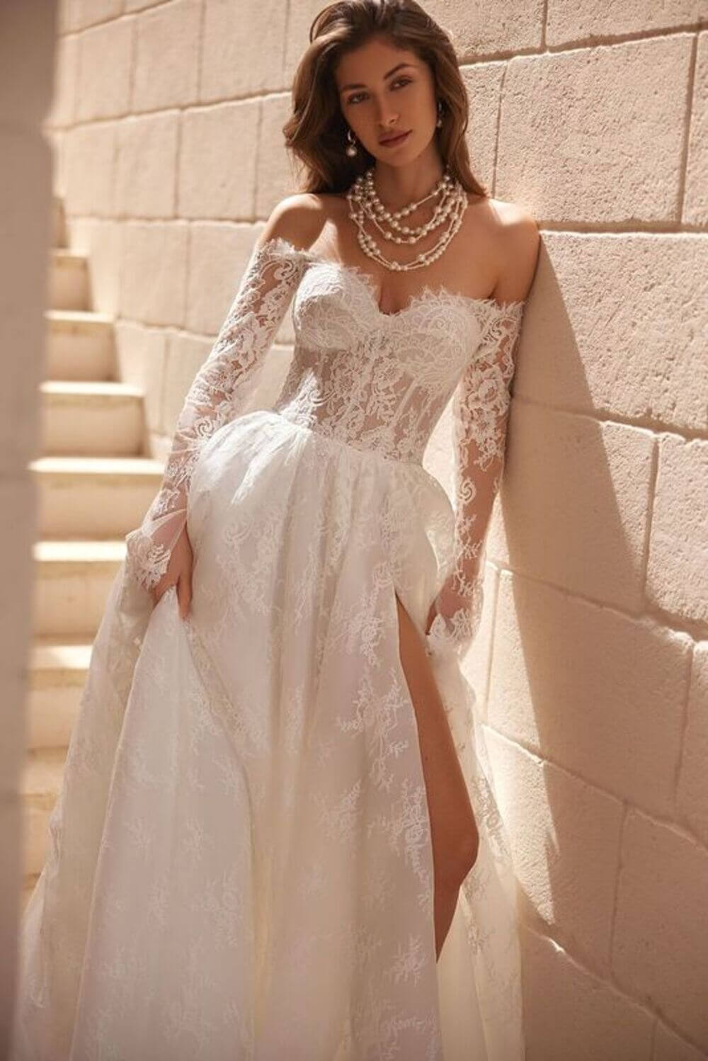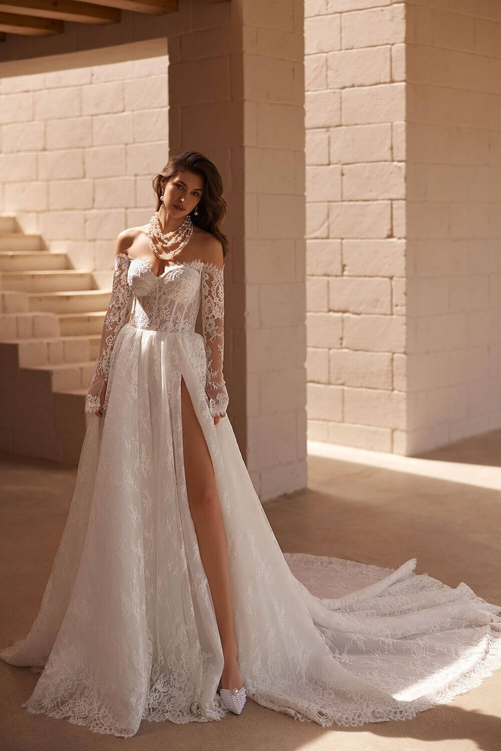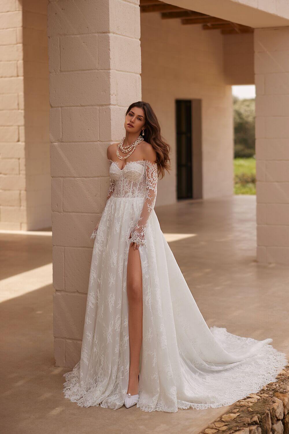 Model:5716 Zmysłowa suknia ślubna wykonana w całości z koronki z motywem roślinnym, z długimi rękawkami. Gorsetowa góra sukni podkreśla biust i talię. Zwiewna spódnica z rozporkiem eksponującym nogę, zakończone długim, spektakularnym trenem. Umów spotkanie